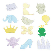 The motifs are fairy ,crown, castle, cinderalla shoe, frog, owl, bird, balloon, elephant, butterfly, cats head and a cat.